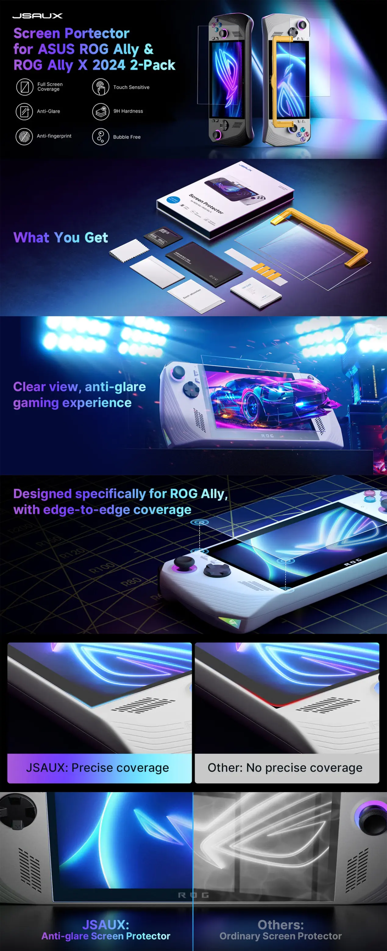 - 【Highly Sensitive】JSAUX ROG Ally screen protector is only 0.33mm ultra-thin and maintains the sensitivity of the device's touch controls. Experience the joy of using the Rog Ally touchscreen without any compromise