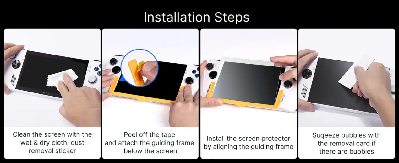 - Note on Guide Frame: The guide frame is not compatible with ROG Xbox Ally / Ally X (2025) or MSI Claw A1M. The protector is precision-cut and provides full-screen coverage — manual alignment is quick and accurate, so you can easily complete the installation even without the frame