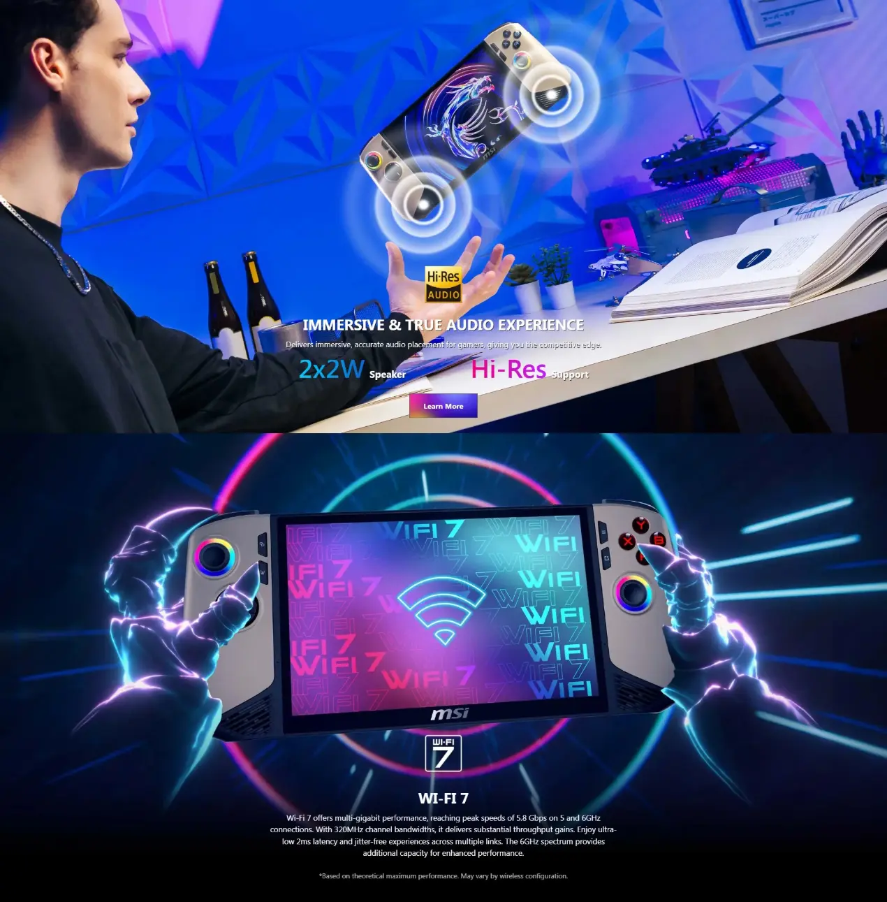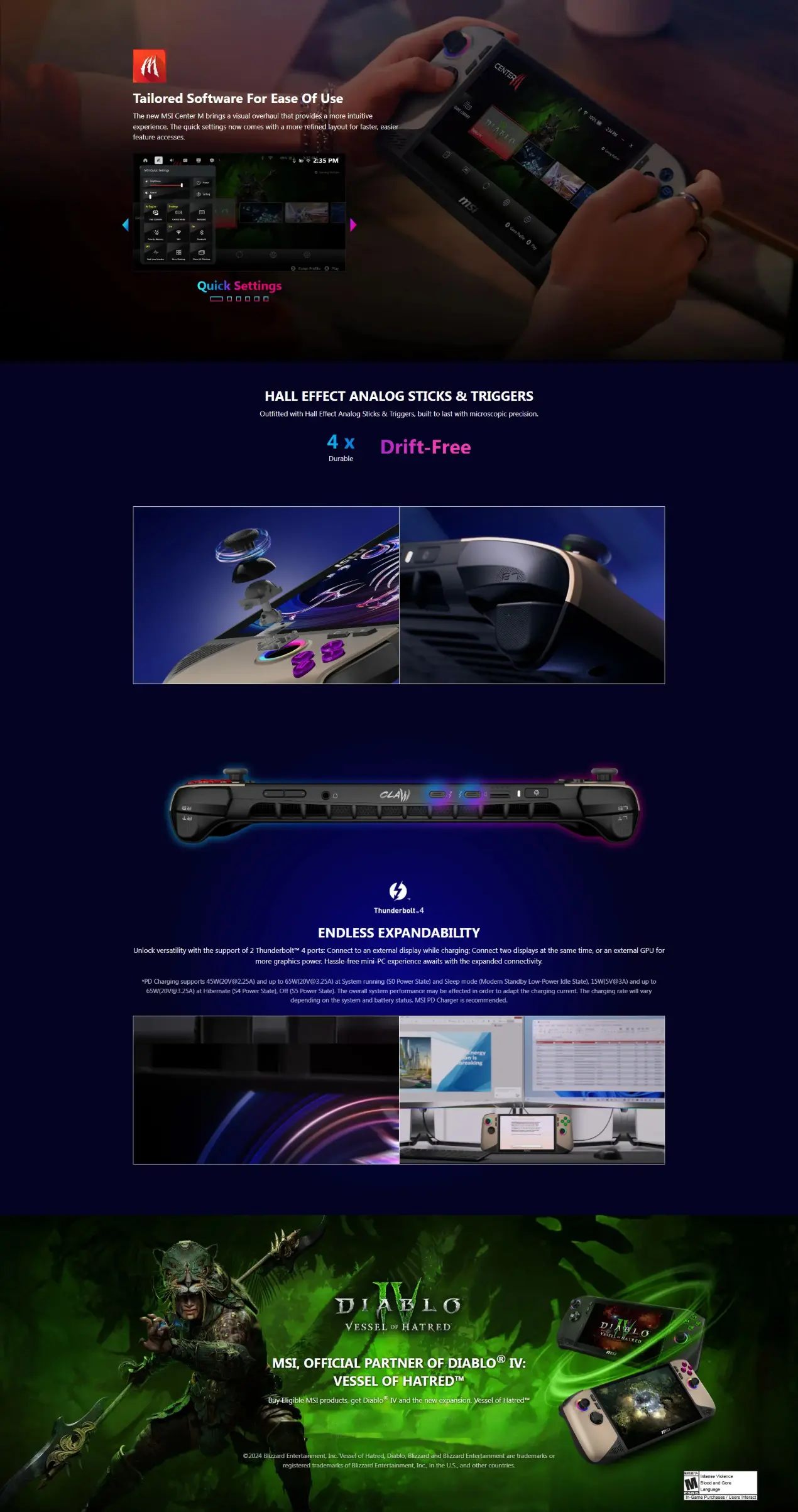 | Control | RGB ABXY buttons RGB L & R Hall Effect analog sticks D-pad L & R Hall Effect analog triggers L & R bumpers View button Menu button MSI Center M button Quick Settings button Macro button (M1/M2) HD haptics 6-Axis IMU |